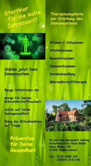 In meiner Praxis biete ich folgende Infusionen an: - Baseninfusionen - Infusionen bei akuten und chronischen Stressleiden - hoch dosierte Vitamin C Infusionen zum Aufbau des Immunsystems und zur Entgiftung - Curcumin-Infusionen bei Krebsleiden - Aufbauinfusionen bei Krebsleiden - Ausleitungsinfusionen - Leberinfusionen - Mitochondriale Infusionstherapie (Unterstützung der Zellatmung bzw. der Energiebereitstellung in der Zelle) |